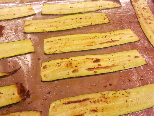 4. Rinse eggplant and zucchini, dry each strip. Sprinkle with oil, salt and pepper and half of the herbs and broil just until soft and start to color, about 5 minutes. Be careful not to burn them.