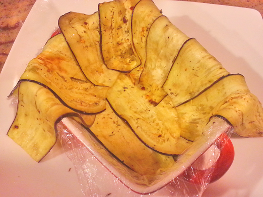 9. Cover the pepper and cheese layers with overlapped zucchini, then eggplant, and finally plastic wrap.