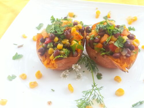 Lately, my favorite lunch has been baked sweet potato with corn and black bean salad; not only is it quick, easy, and delicious, but it is a nutritional powerhouse to boot. Sweet potato is packed with vitamins A, C, B5, and B6 as well as manganese, tryptophan, potassium, copper and fiber. Beans are great, as they keep your colon healthy and lower risk of type II diabetes and a plethora of cardiovascular diseases. The onions, jalapeno peppers, cilantro, parsley, spices, and olive oil are equally great for you. I absolutely love the combination of flavors in this dish, and eat it at work at least twice a week. I normally make the salad the night before and bake the sweet potatoes in the morning while my kids are getting ready for school. In the summer, I like to add grilled corn and fresh picked herbs to add a wonderful flavor to my dish. However, these are not the only ways you can make this dish. If you want, you can also add cherry tomatoes, bell peppers, avocado, or anything else that might mesh well with the other ingredients. However, the combinations I shared with you are some of my favorites.