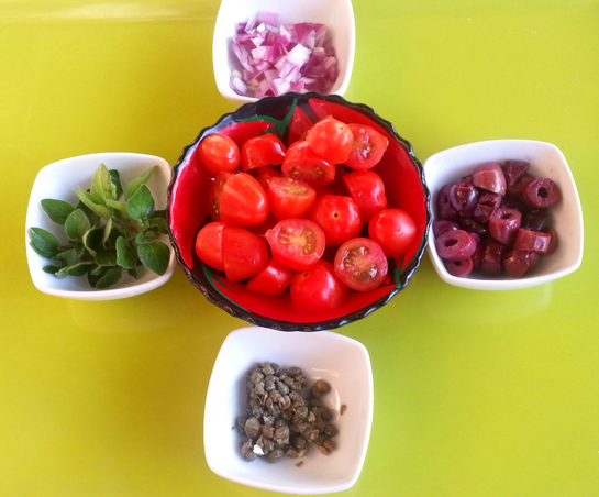 I just love how the flavors mesh with the slight bitterness of the cured olives, saltines of the capers, sweetness of the cherry tomatoes,