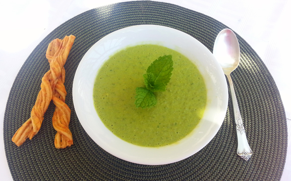 Walking through the market yesterday, my eye gaze fell upon a bag of shelled peas that I just had to buy. Initially I wanted to make pea risotto, however this morning while tending my little garden, I found an abundance of overgrown mint. Somehow it does not feel like summer in New York, not the usual hot, sticky and humid summer. The nights are chilly, and the air is deliciously refreshing, and it does feel like spring. This minty pea soup is perfect for this weather, it doesn’t include a lot of ingredients and cooks in about 20 minutes. The flavors are delicate and fresh, not your ordinary split pea soup. Paired with Parmesan twists – perfection in a bowl.