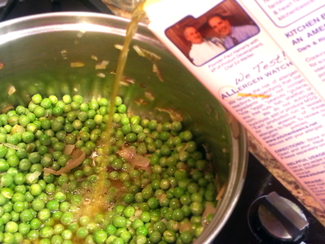 - Add peas to the pot and saute for another minute, then add stock and adjust the seasoning. Simmer for about 8- 10 minutes until peas become soft.