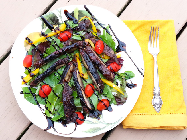 - Slice the grilled mushroom caps and add to tossed salad, dress the salad with the left over marinade and balsamic reduction, to add tang.