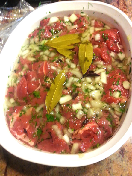 5. Meanwhile make bay leaf tea. Place bay leaf in a cup, and pour boiling water over them, cover and let seep until the liquid is room temperature. Once the bay leaf tea is cool, pour it over the meat and onions, mix to distribute the liquid evenly and cover the meat with plastic again.  Brine for 3-12 hours. kebob_2