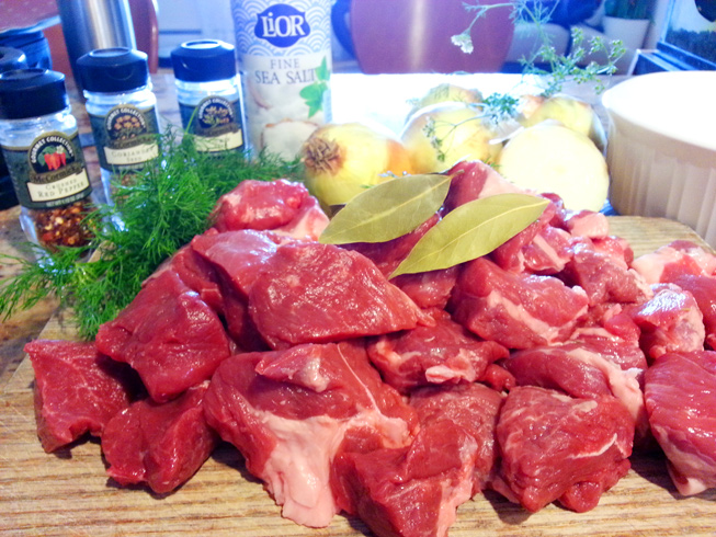 • Boneless Leg of Lamb, trimmed from fat(do not trim all the fat, we need the fat to baste the meat ),  sinews removed, cut into cubes,