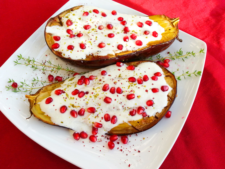 - When the eggplant is soft, place it on a serving dish. Spoon the sauce over it, sprinkle with zaatar and pomegranate seeds.