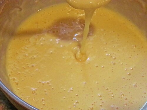 - Add the flour to the liquid, do not overmix. The dough should be the consistency of thin sour cream, or kefir. It’s a very light dough.