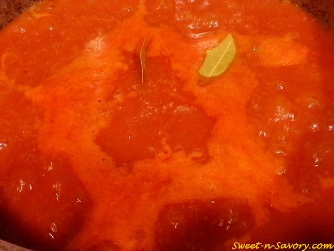 - Add crushed tomatoes, chicken broth and tomato paste to the vegetables and bring to a simmer. I usually puree the vegetables at this point, but you may choose to leave them as is. The sauce should be a little sweet and a little tangy, usually the caramelized onions and carrots provide enough sugar for the sauce. Adjust the taste with salt and pepper, sugar and lemon juice.