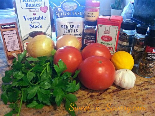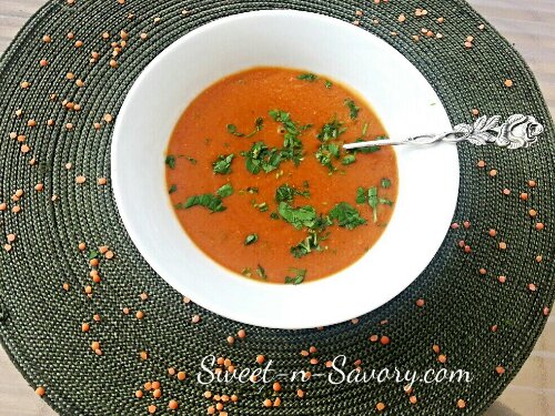 Last Sunday was absolutely hectic – I had so many errands to run in addition to driving boys to and from Sunday school, just busy, busy, busy and busy.  With the weather changing three times a day, I also caught a mother of all colds, and I had the biggest craving for comfort food -something that warms you up and gives you a hug from the inside. Taking a look in my cupboard gave me an idea for a red lentil soup. I prepped everything in the morning – sautéed the onions with the spices, added broth and chopped tomatoes brought the base to boil, added everything into the slow cooker, set it for 4 hours and ran out of the house. This soup was a hit – aromatic and flavorful, easy on the waist line and extremely satisfying.