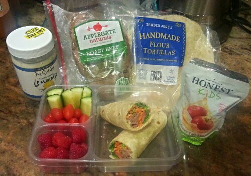 Lemonaise(mayo w/lemon & herbs) spread thinly all over tortilla, veggies and roast beef piled in the middle and wrapped.