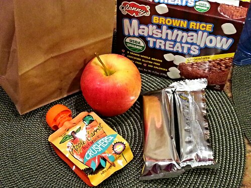 Snack is for the third grader, he gets both an apple & carrot sauce and an apple, he will decide which one he wants more at snacktime, and double the rice crispies treats for sharing. (Eyeroll)