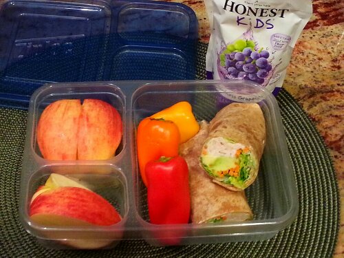 Turkey, romaine lettuce, carrots and avocado in a whole wheat tortilla. Baby sweet peppers, an apple and a juice drink.