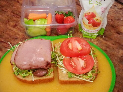 Pea shoots, roast beef , a little bit of aioli (garlicky mayo), and tomato sandwich, with baby carrots, cucumbers and strawberries.