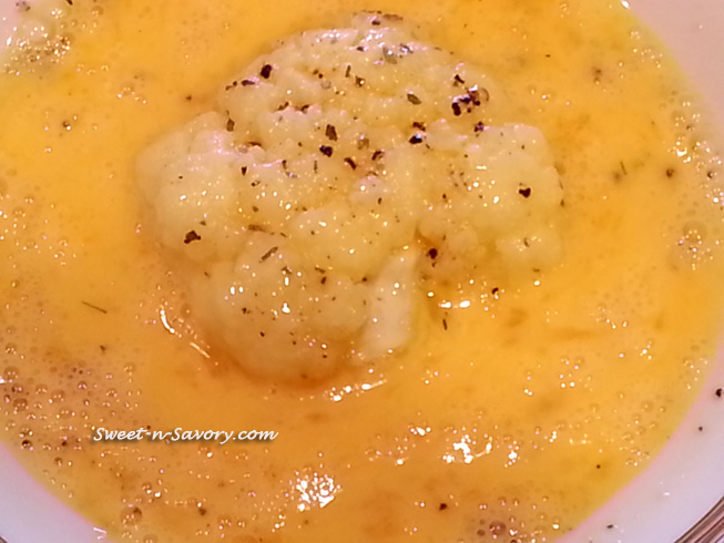 4. Take each cauliflower floret  dip it in eggs , almond_cauliflower2coat it with almond meal and then place it on a baking sheet.   almond_cauliflower1
