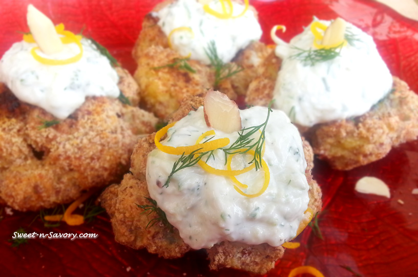 A twist on battered and fried cauliflower my mom used to make, this simple preparation packs a lot of taste, and nutrition, without the extra fat. Crunchy almond shell and soft seasoned cauliflower pairs very well with the cool yogurt tzadziki sauce as a side dish, appetizer or a meal on its own.