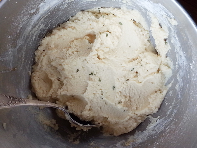 - Mix ricotta cheese with a mixer until smooth, add the eggs , sugar, salt , melted butter and thyme leaves. If the ricotta is very ” wet ” – add more flour. If ” dryish ” – water.