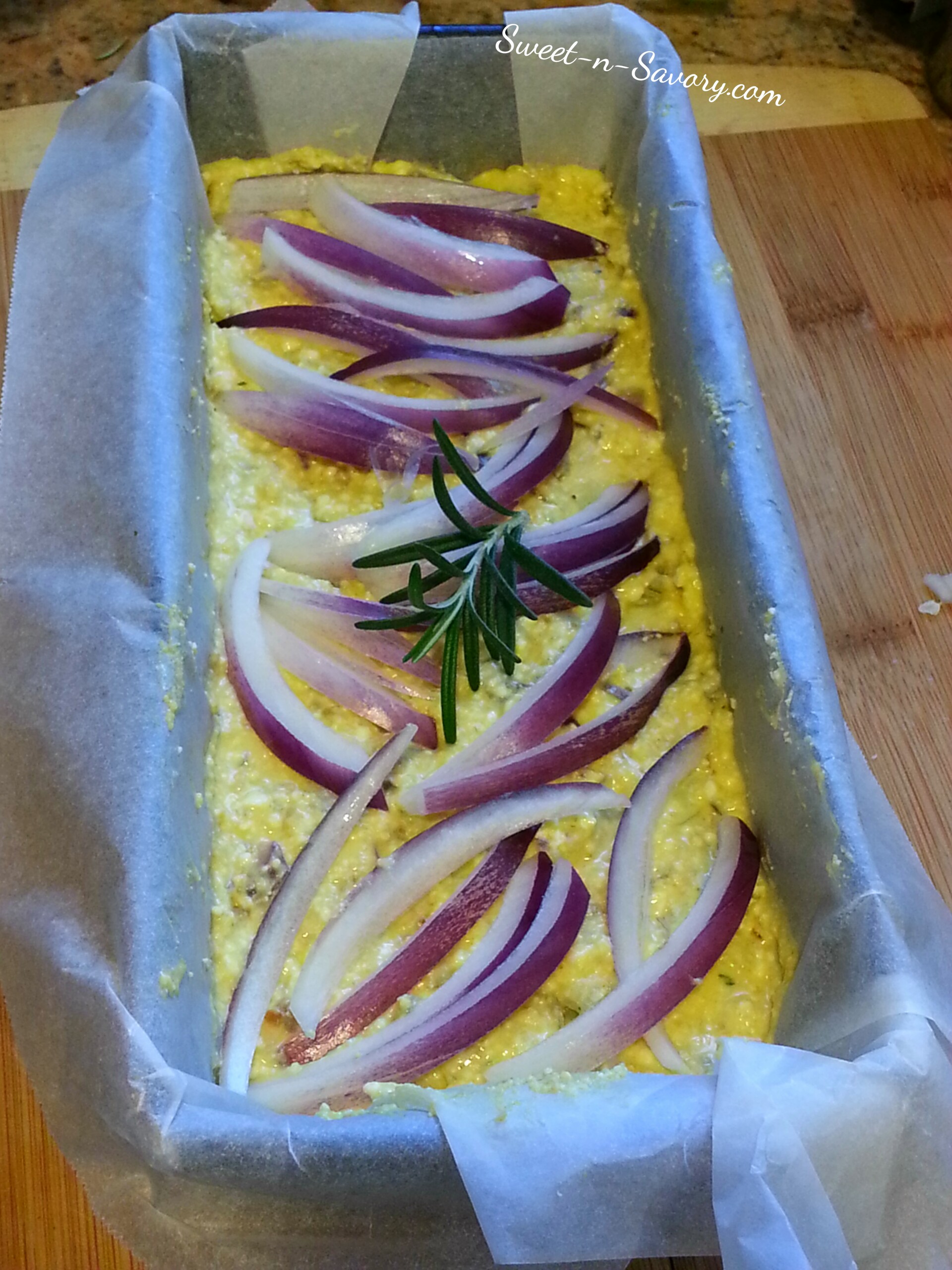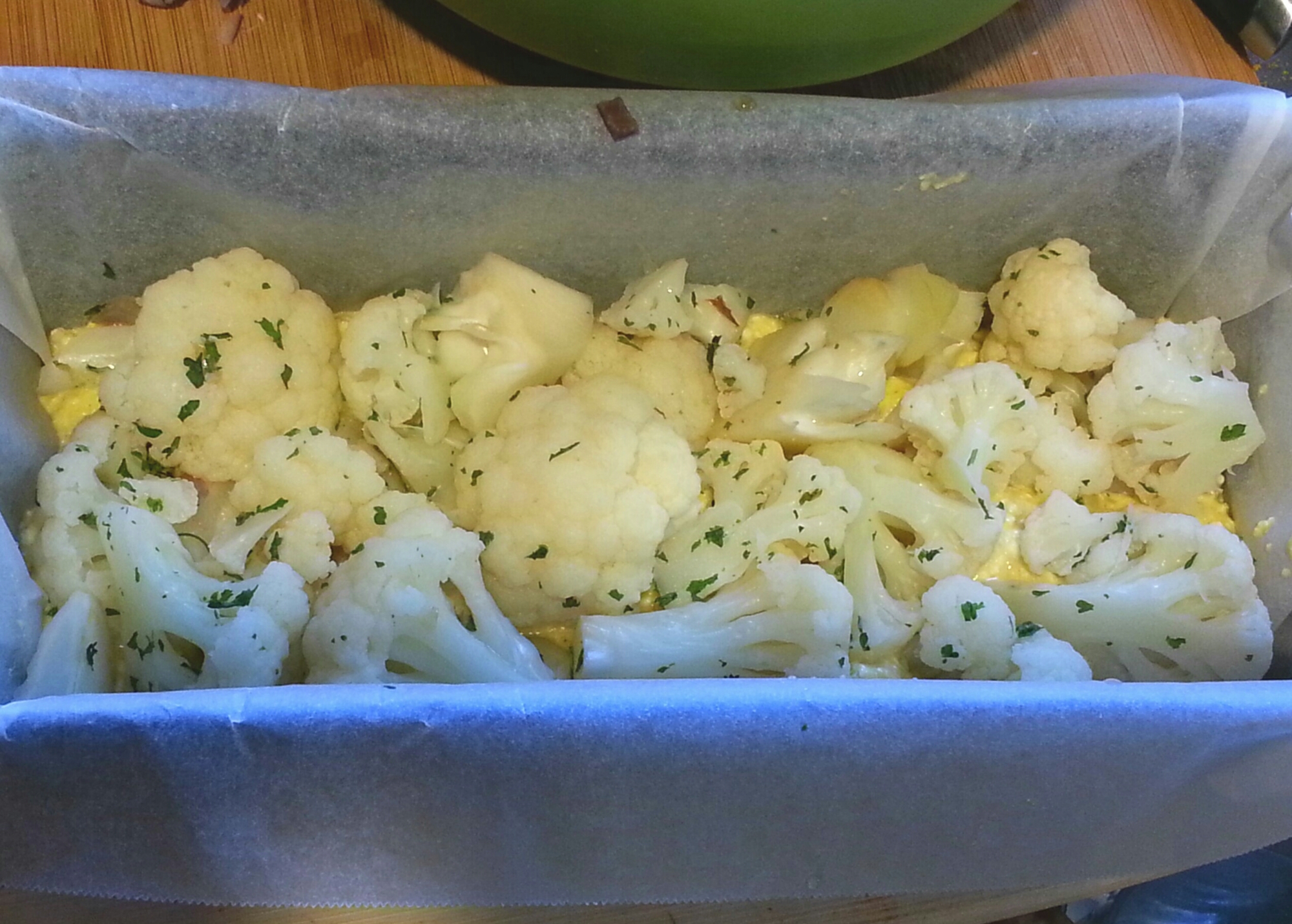 - Line a loaf pan with parchment paper. Place about half of the mixture into the pan. Top the batter with cauliflower.