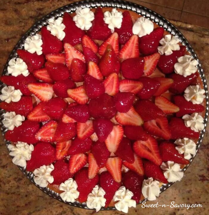 12. Stir apricot preserves with brandy in a saucepan over medium heat. Strain preserves. And brush the berries with the apricot glaze, letting the mixture drip onto the cake between the berries.