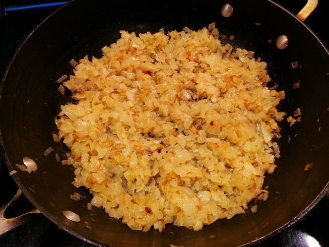 - Dice the onions and sautee on medium low heat, until they are translucent and start to turn golden. Cool the onions.
