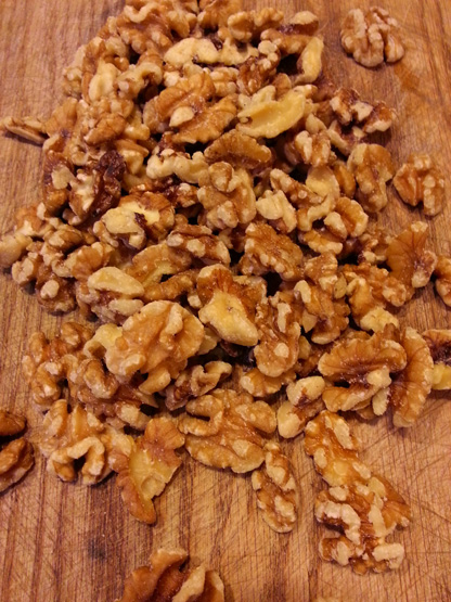 - Place a strip of eggplant on a cutting board. Spread about a teaspoonful of the walnut paste and roll.