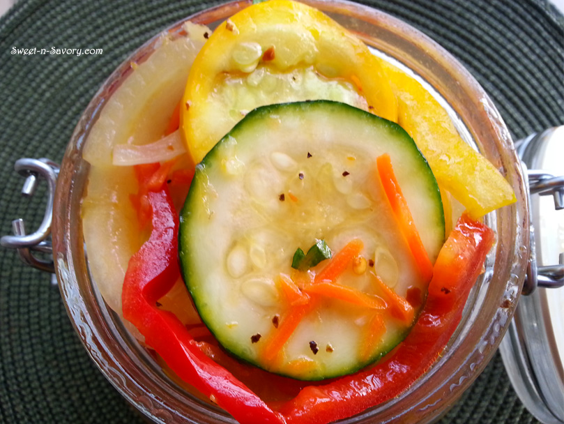 - In a small sauce pan heat the 1/4 oil til hot but not steaming, take off the heat and immediately add vinegar and spices to oil, wisk briskly and pour into the vegetables. Mix the vegetables with the marinade and pack tightly into container.