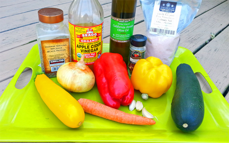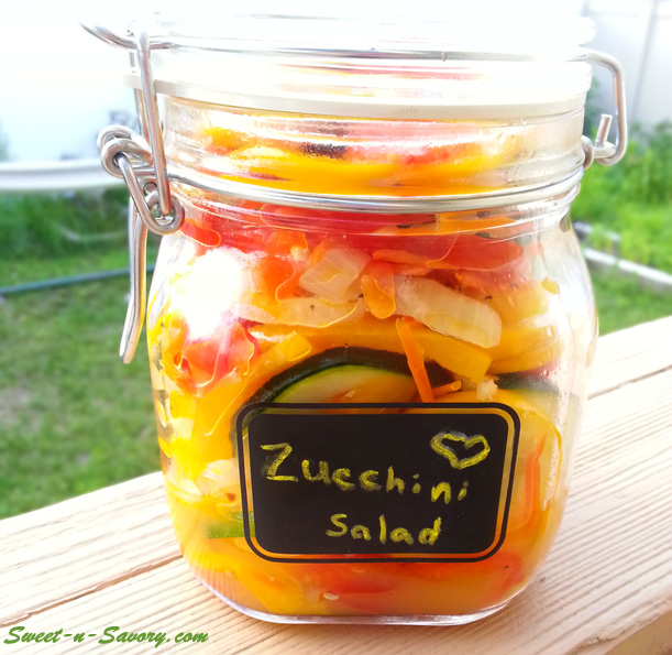 My mother-in-law made this salad for us on the fourth of July and everyone loved it. Theoretically it can be kept in the refrigerator for a week, but in my house its usually gone the minute I say that it’s ready. Adults like it as a side dish to grilled meat/fish, kids love it as a topping for burgers, and hot dogs, but anyway you eat it – it’s absolutely delicious and very pretty.