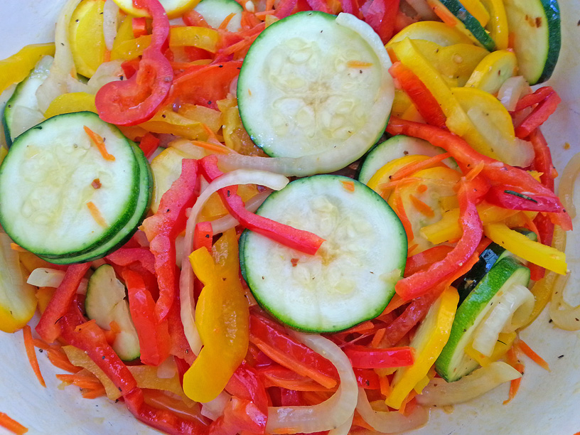- Add the peppers and onions to zucchini.