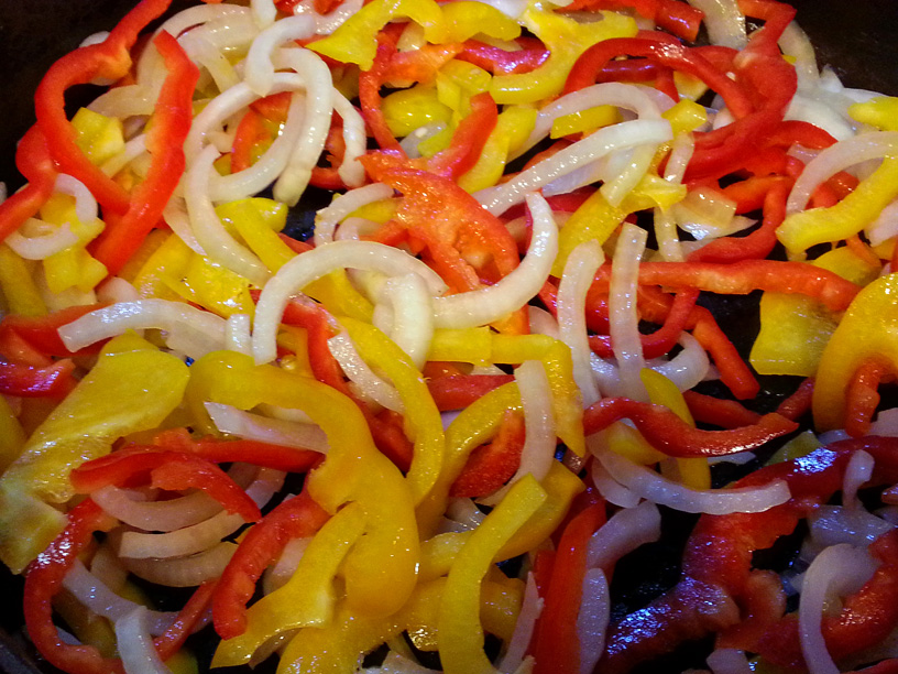- Heat the reserved oil in a pan and add peppers and onions. Saute for two minutes.