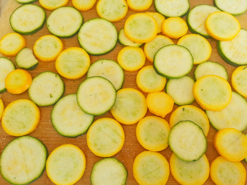 - Cut zucchini into rounds. Lay on a cutting board and sprinkle with salt. Let stay for about 20-30 minutes to release the liquid. Rinse, pat dry and place into a bowl.