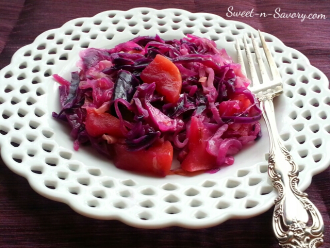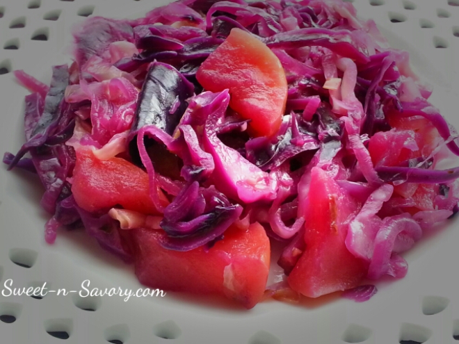 - Add cabbage to onions and apple, saute for about a minute and add the apple cider mixture. Stir together and cook until all the liquid evaporates.