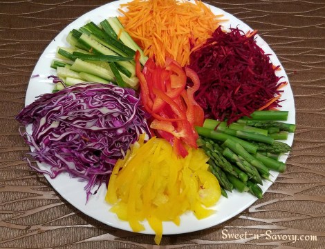 Here I have raw purple cabbage, raw cucumbers, raw carrots, steamed asparagus, raw yellow and red bell peppers.